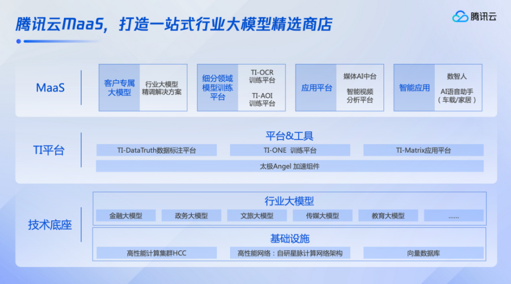 从腾讯云MaaS的整体架构来看,拥有技术底座、TI平台、MaaS服务全栈的能力,帮助企业解决算力、算法、工具、应用等各种难题。